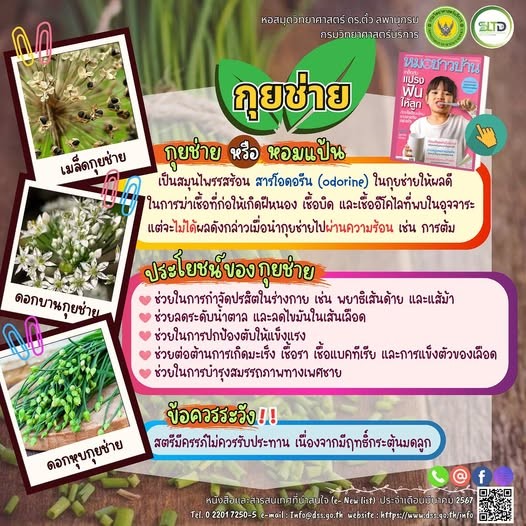 🙌🏻 “Kuy Chai” (Chinese chives), commonly known in dishes like chive dumplings, actually has different local names in Thailand: it is called “Hom Paen” in the North, “Phak Paen” in the Northeast, and “Phak Mai Kwat” in the Central region. Although it has a strong, pungent smell that many people may not like, it contains numerous hidden health benefits. Today, the Science Library of the Department of Science Service has gathered its benefits to share with you 🥰 🌿 Chinese chives can be used in a variety of dishes, such as stir-fried chives with eggs, stir-fried chives with tofu, stir-fried chive flowers with pork liver, chive dumplings, and chive-based pork dumplings. In addition, chives are rich in nutrients beneficial to the body, including dietary fiber, beta-carotene, calcium, iron, and phosphorus. 🌿 Medicinal properties of Chinese chives 🪱 Help eliminate parasites in the body, such as threadworms and whipworms🩸 Help reduce blood sugar and lower blood fat levels🥠 Help protect and nourish the liver🚫 Help prevent cancer, fungi, bacteria, and blood clotting🦾 Help enhance male sexual performance 🌿 Precautions when consuming Chinese chives ‼️ People with yin deficiency (e.g., those with fever, sweaty hands and feet at night) People with excess...